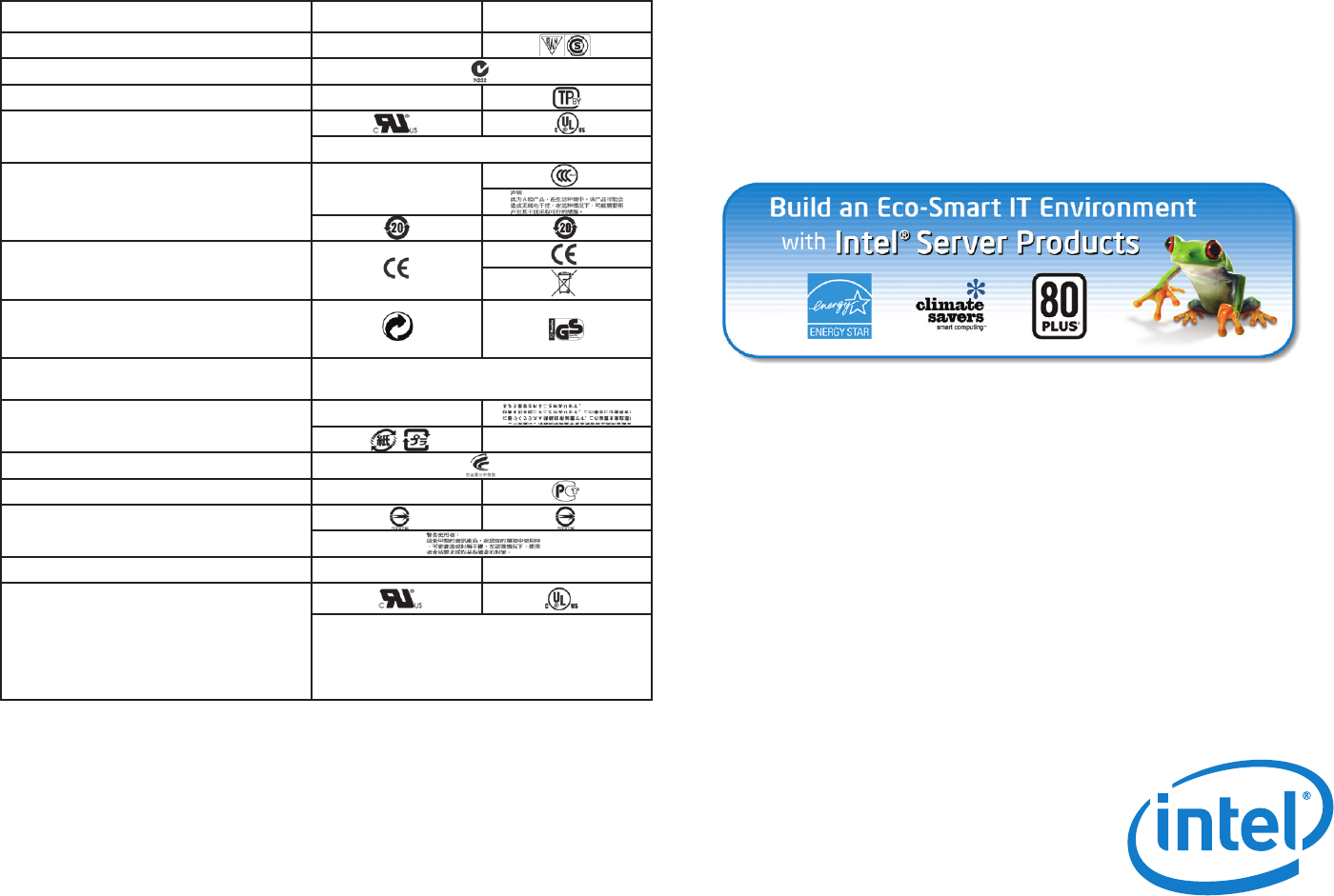 Class A EMC requirements. Intel server products comply with RoHS (Restriction of Hazardous Substances).